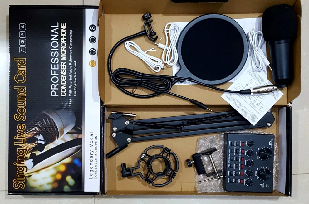 All-Inclusive Kit – Includes a studio condenser microphone, adjustable boom arm, pop filter, mic cover, and professional sound mixer